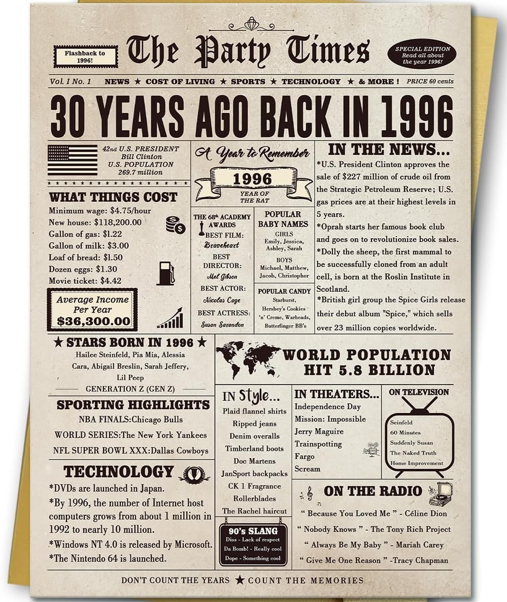 & Free Shipping- 30 Birthday Gifts– Find interesting 30th birthday cards for your children. The cards contain some specific events which can help you review interesting events with family and friends